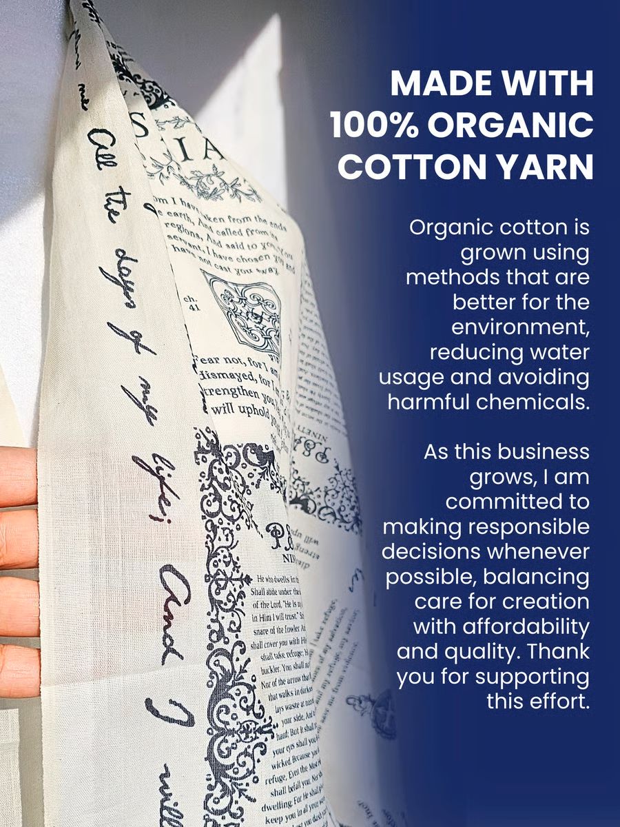 This scarf made with 100% organic cotton yarn, drapes well and stays put, ideal for those seeking a tangible connection to the Word during their daily devotion or offering a comforting presence on any journey.