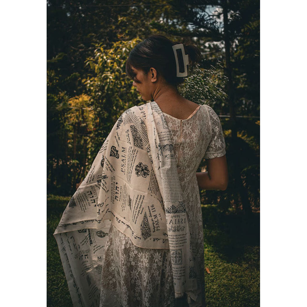 This full-length church scarf's off-white background and black scripture print offer a peaceful palette, perfect for meditation or as a graceful head covering at church. It's designed to complement any outfit and occasion - from worship services to family gatherings, ensuring you carry His word with you.