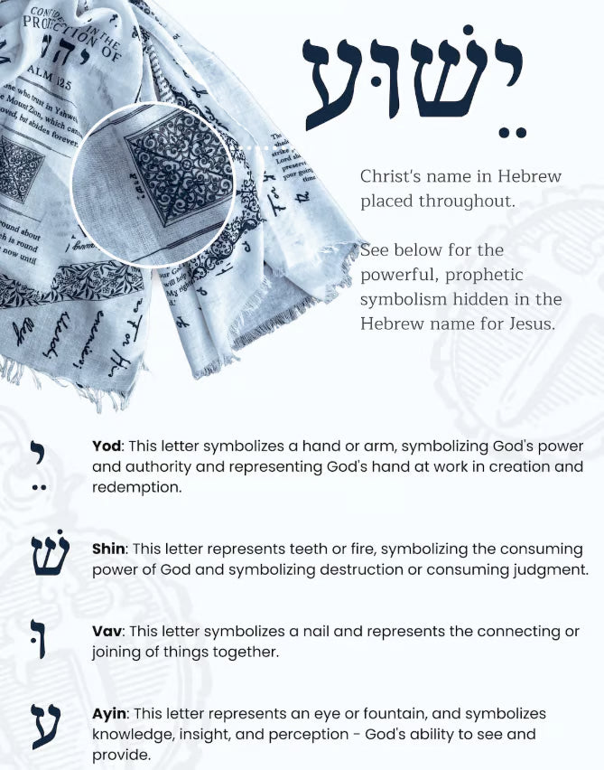 Adorned with scripture, this scarf is a declaration of God's constant love and care, with Jesus's name, "Yeshua," in Hebrew, affirming His role as our protector throughout. Featuring seven favorite scriptures, including Psalm 23 and Psalm 91, it offers spiritual comfort and protection to those who seek solace in God's word.
