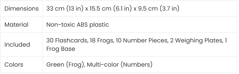 This comprehensive set includes 30 double-sided activity cards, 19 mini frogs, 10 number figures (1–10), 2 weighing plates, a frog base, and a user-friendly instruction manual. Children can explore numbers and math concepts in fun and interactive ways.