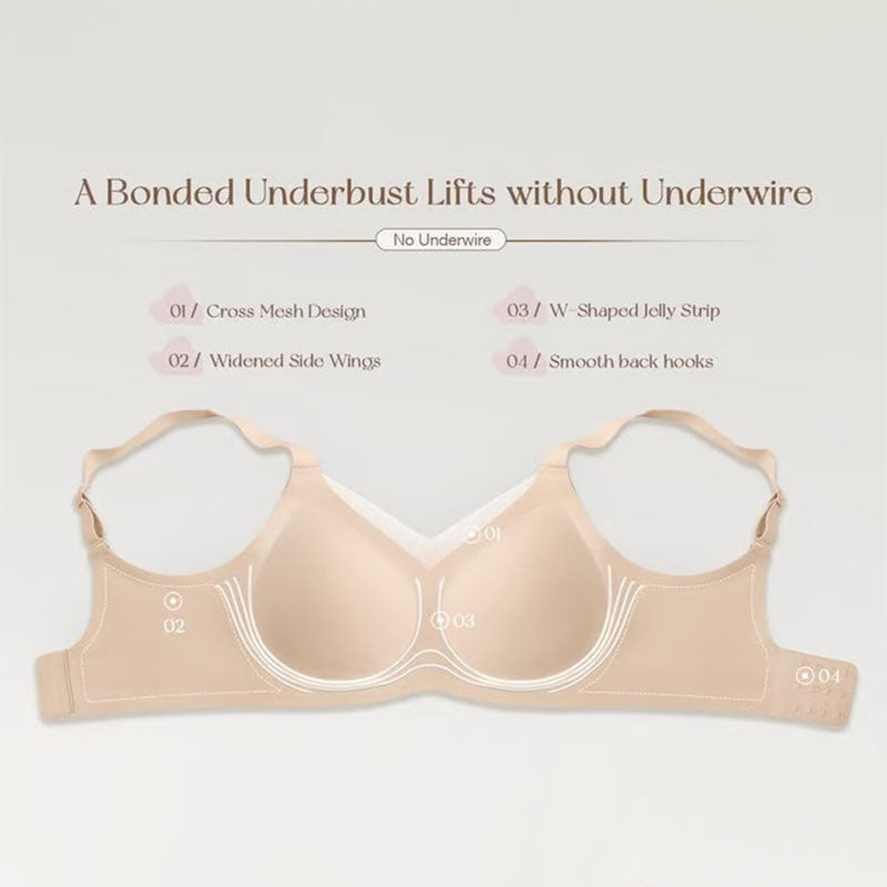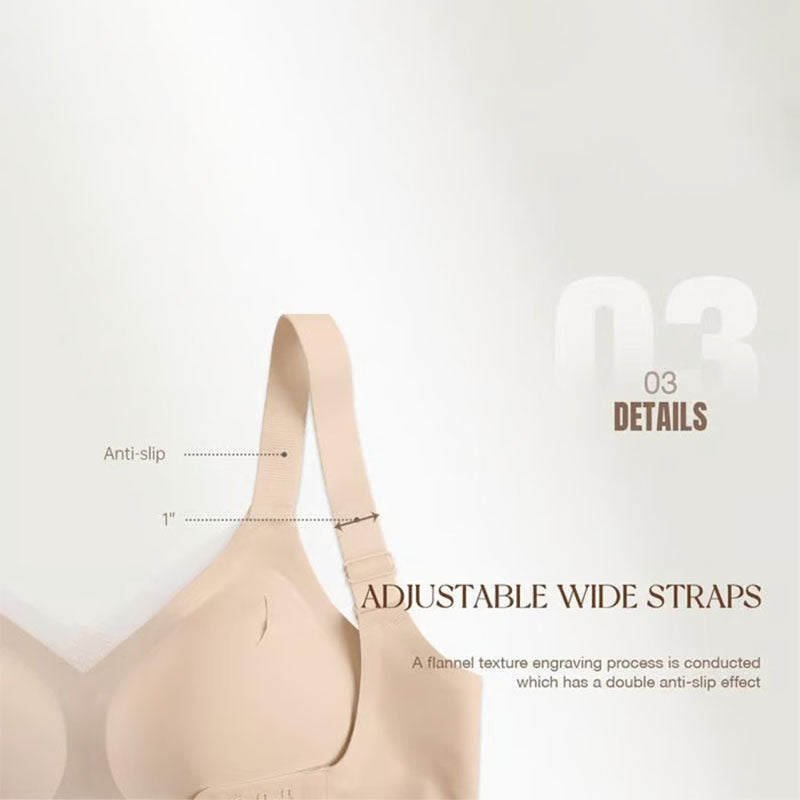 This bra features wide straps designed to relieve pressure on your shoulders. This helps to lift and support the chest, keeping it in a more upright and stable position. The inside of the shoulder strap is made of flannel texture engraving technology, which has a double anti-slip effect and is very suitable for women with plump breasts, thicker shoulders and rounder shoulders.
